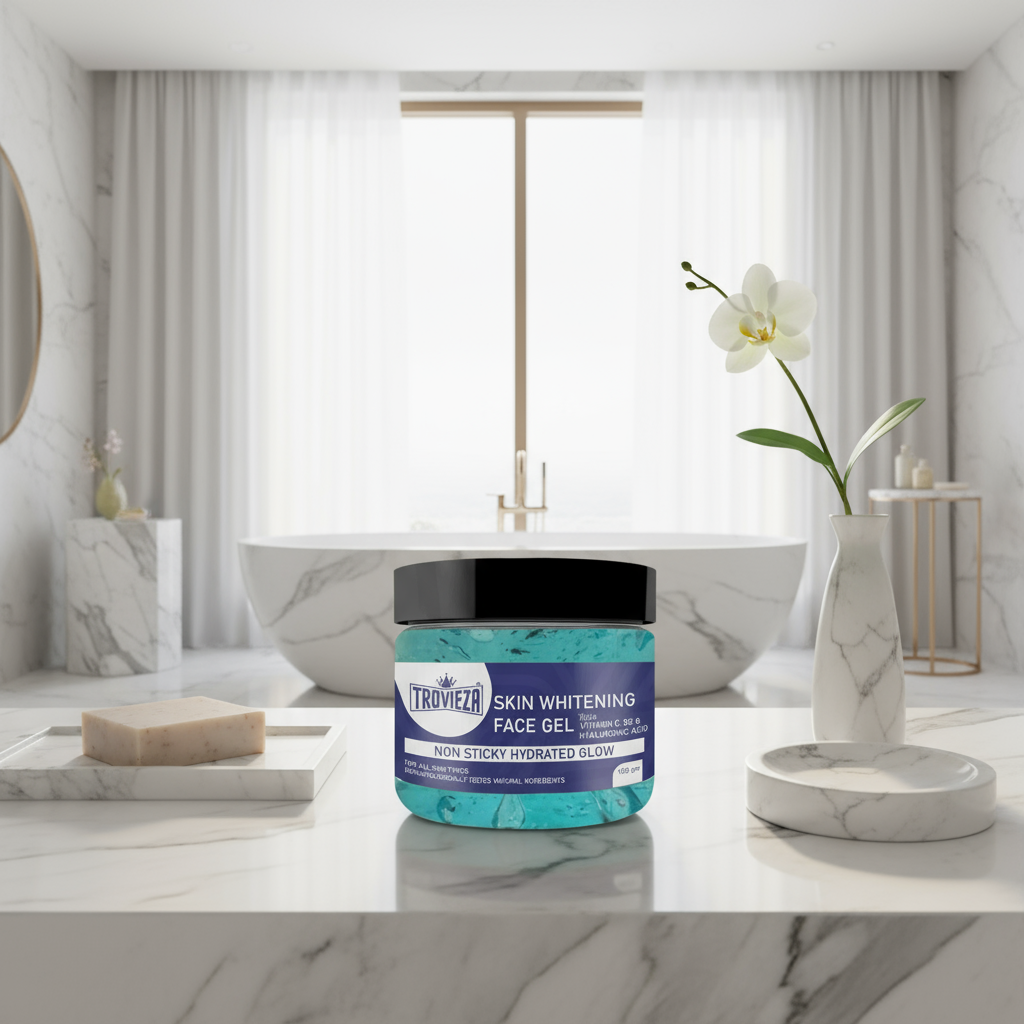 Trovieza Skin Whitening & Brightening Face Gel delivers a refreshed, radiant glow with its blend of Vitamin C, B5, and Hyaluronic Acid. This lightweight, non-sticky gel is suitable for all skin types and works to lighten dullness and diminish dark spots while providing deep hydration. Presented in a 100 gm pack, it offers a smooth, luminous complexion ideal for daily use. Experience the elegance of naturally brightened and hydrated skin with this carefully crafted formula.